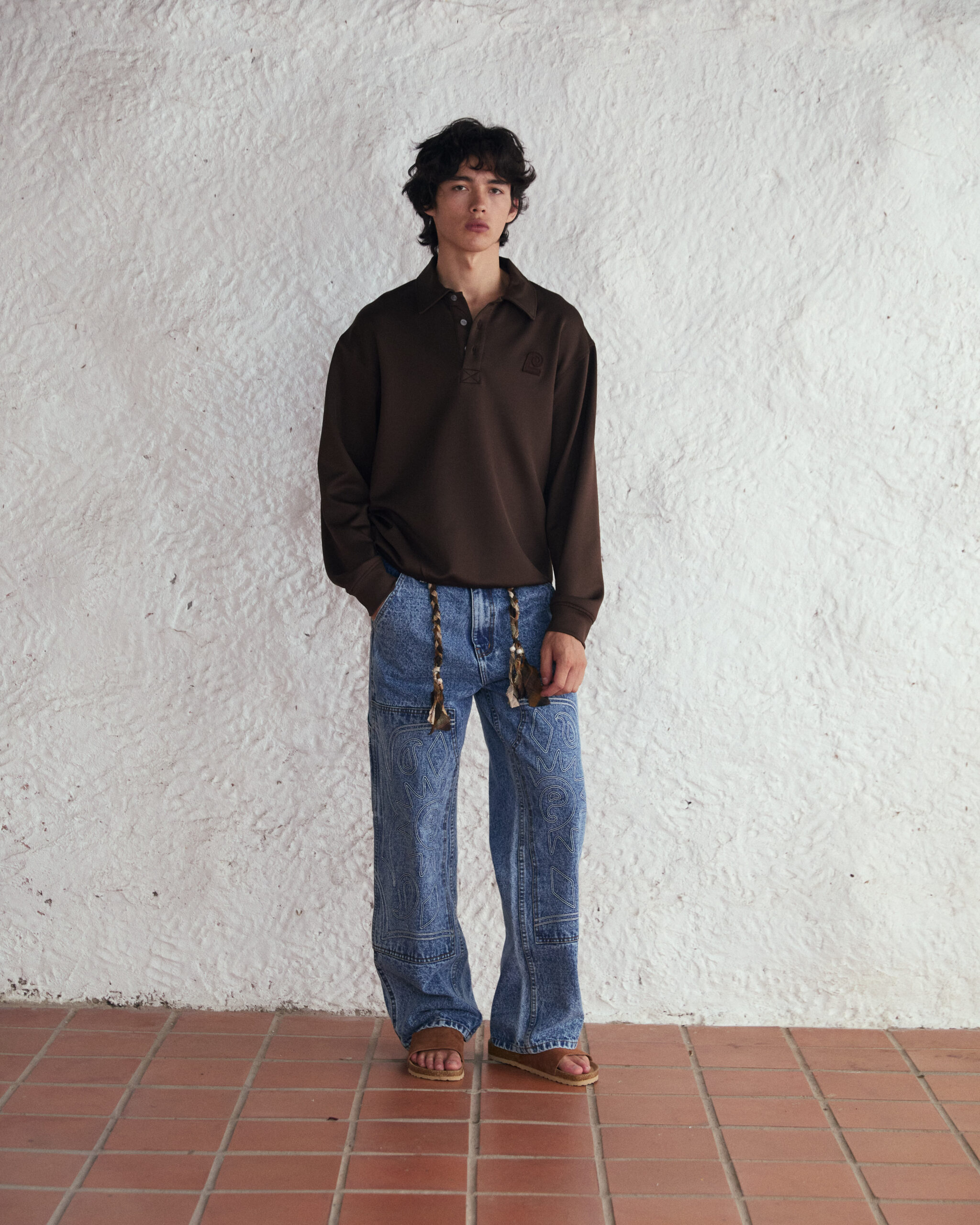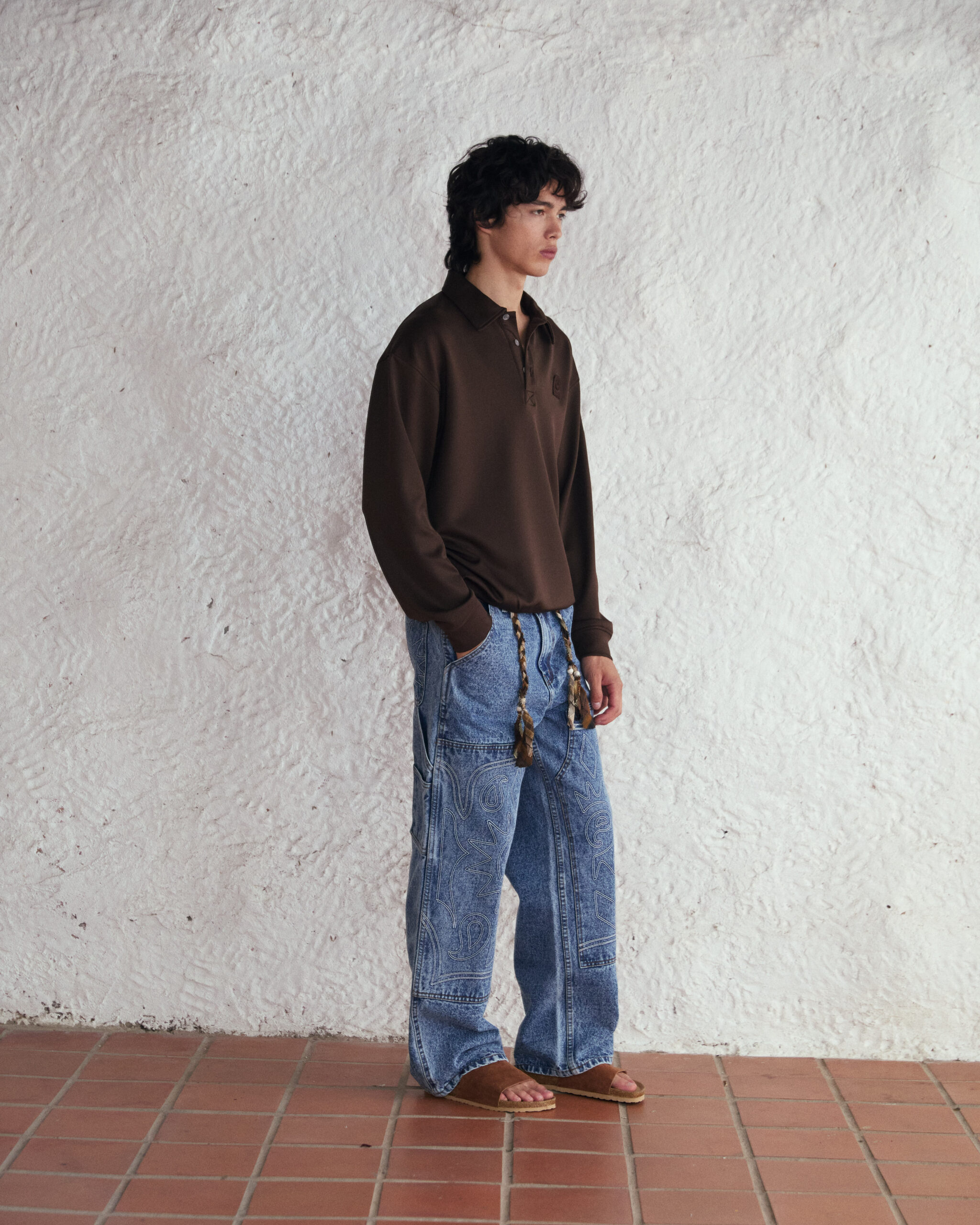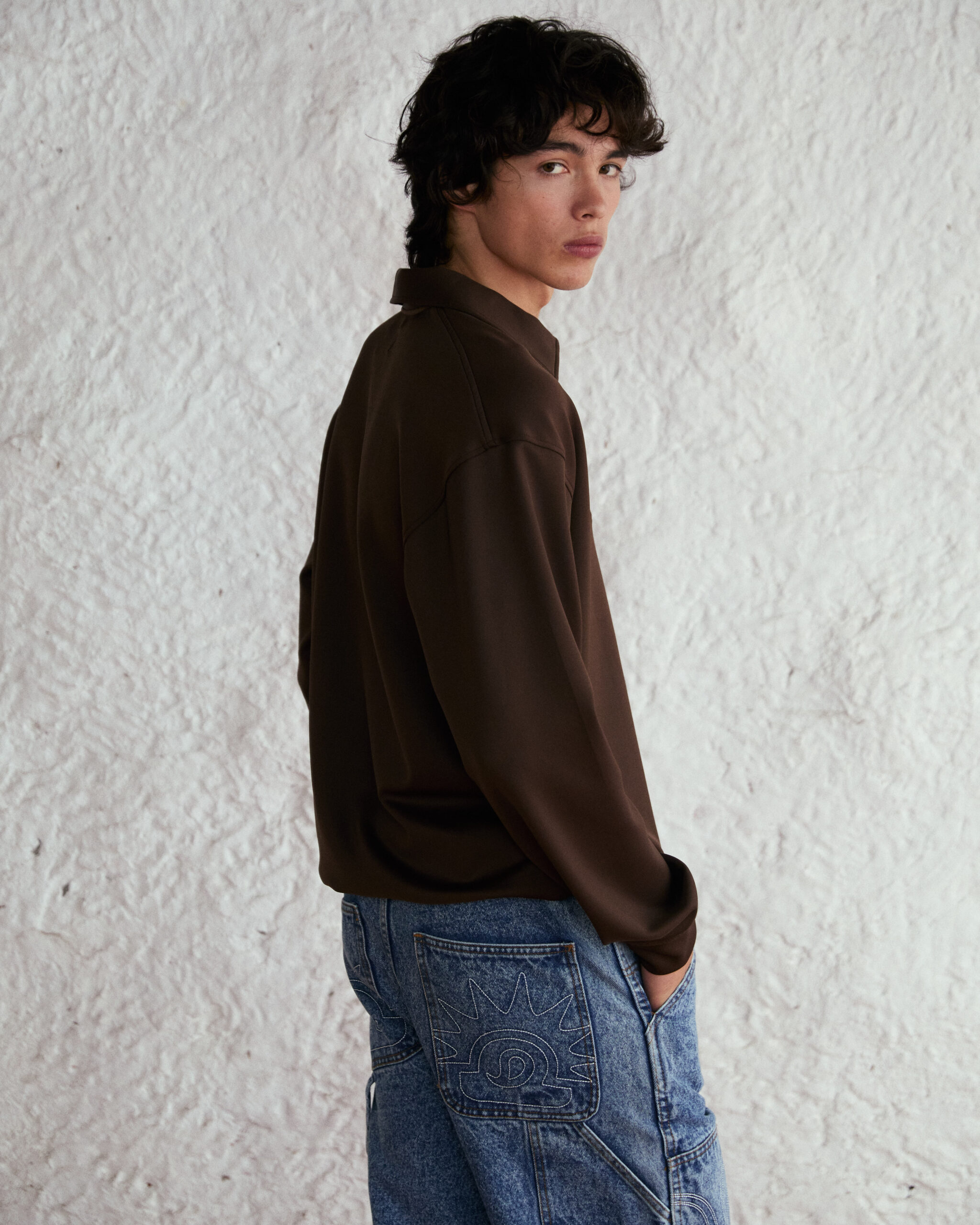 Body fit long sleeve polo shirt with LEISURE icon logo applique on the side