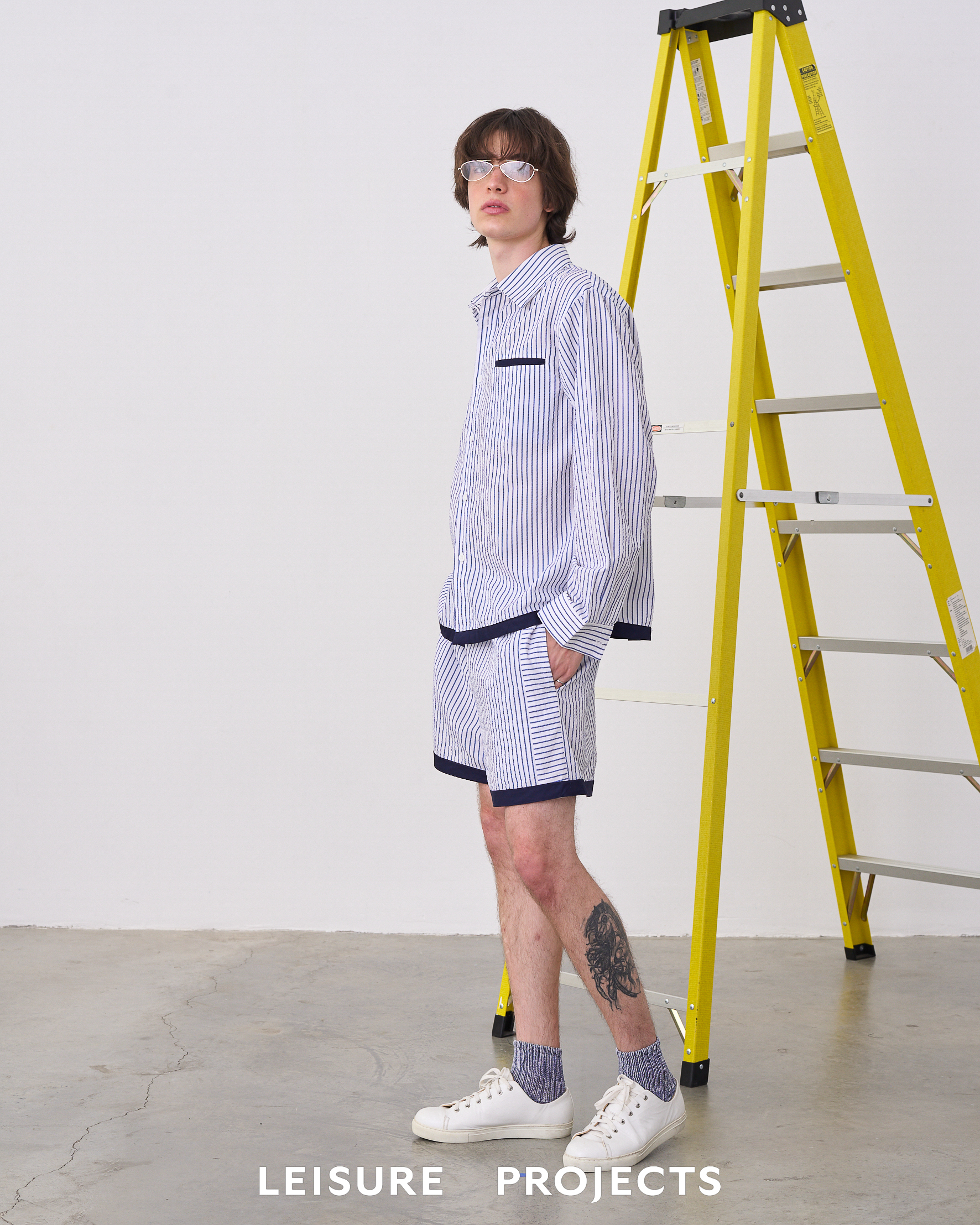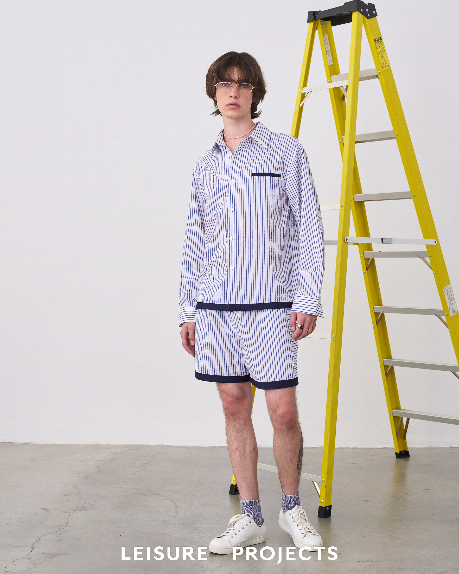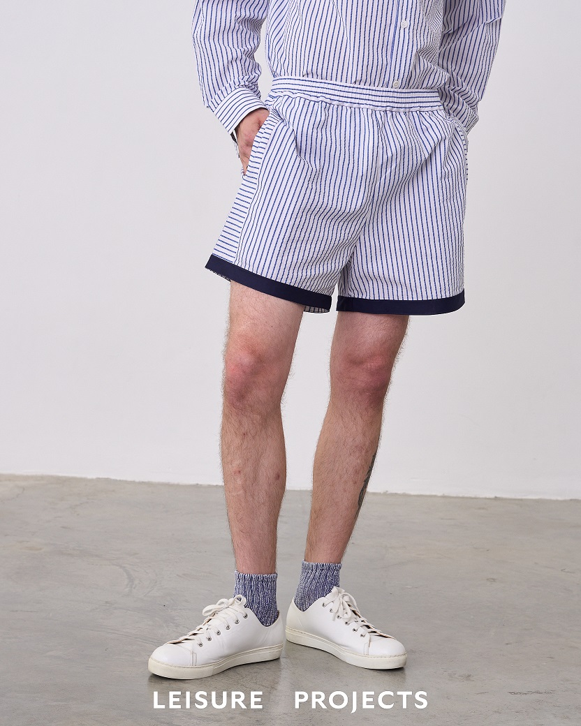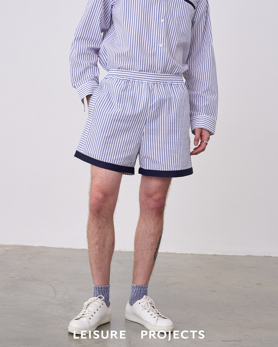 กางเกงเอวยางยืด ดีเทลผ้า seersucjer ตัดต่อผ้าสี contrast ที่ปลายขา
