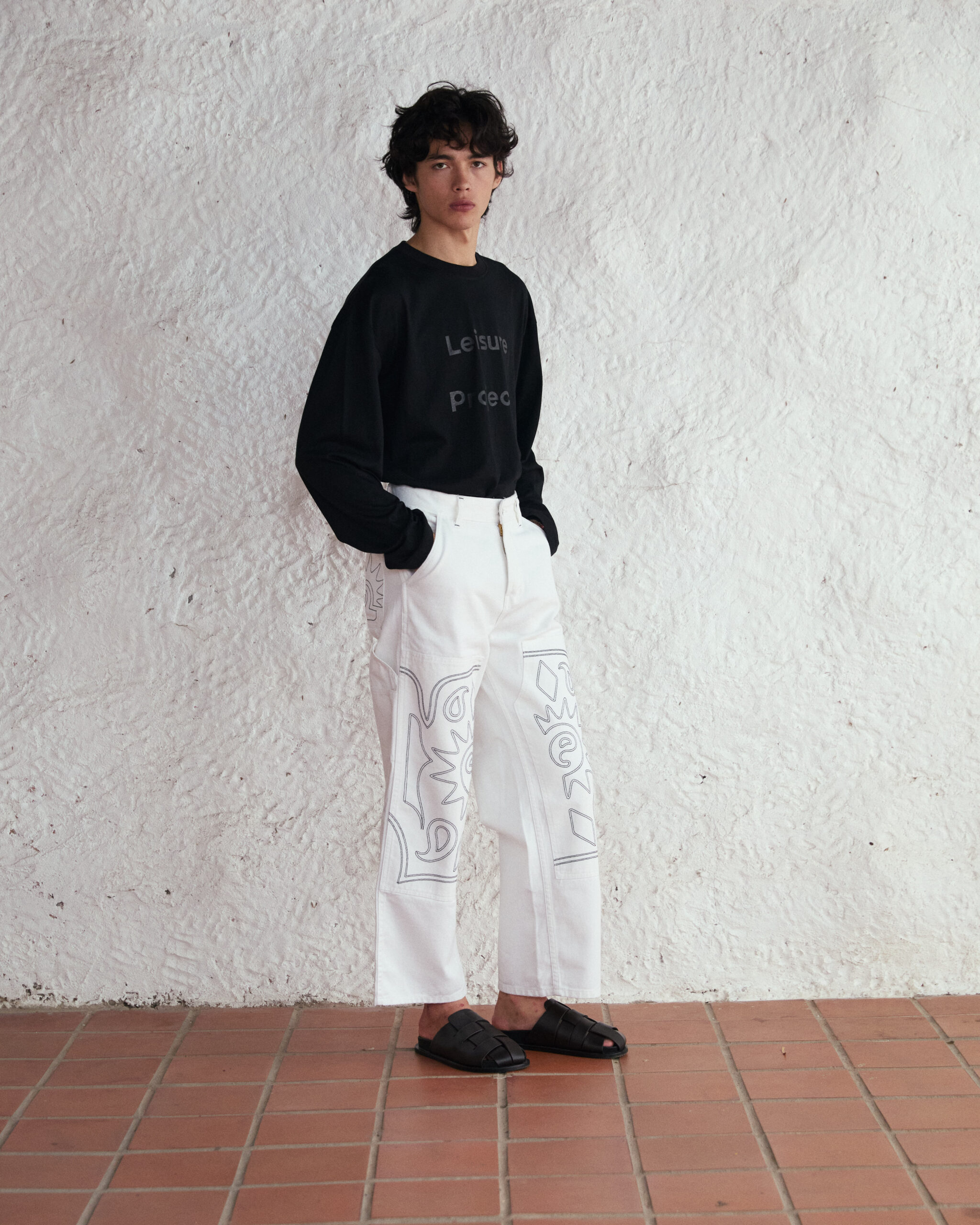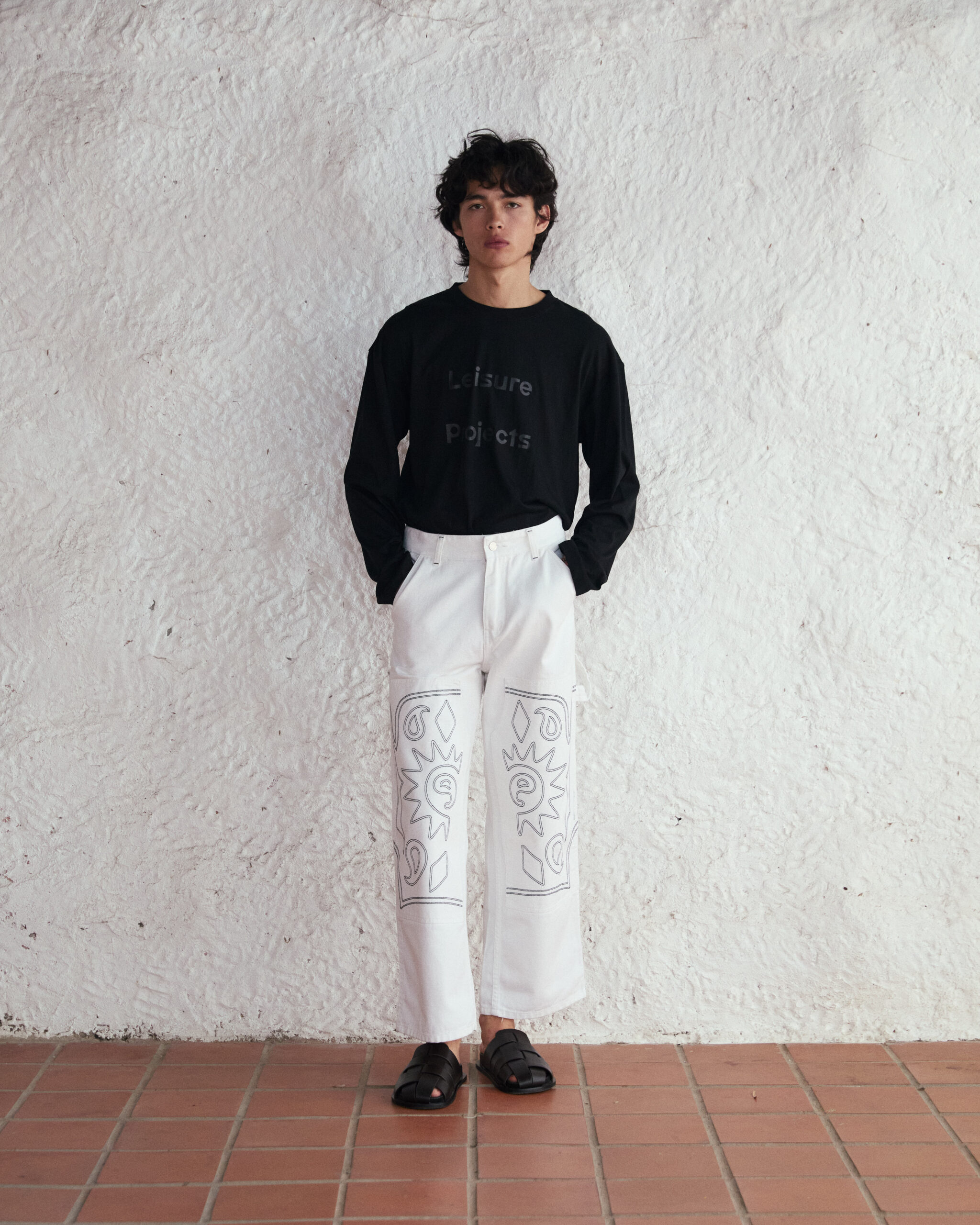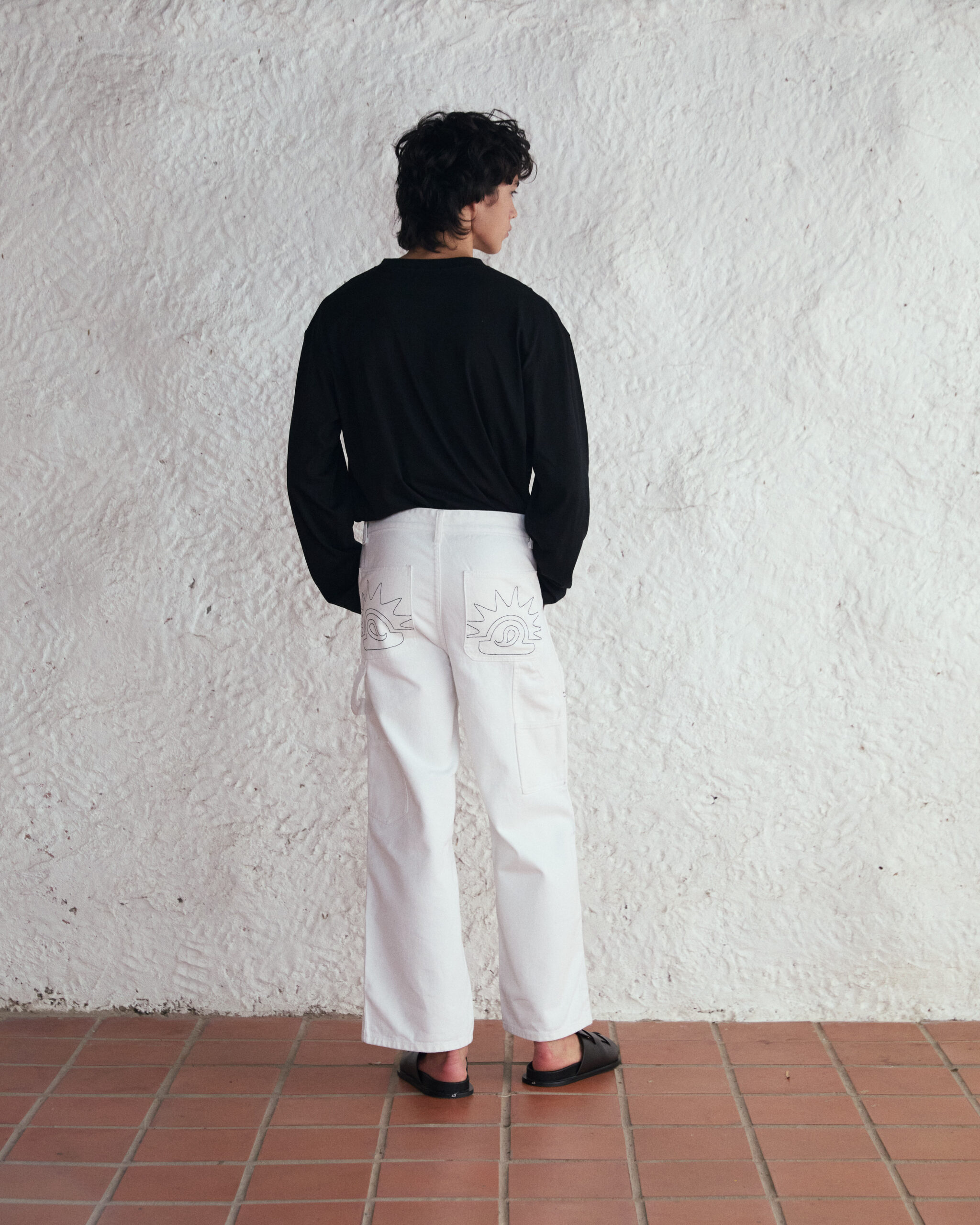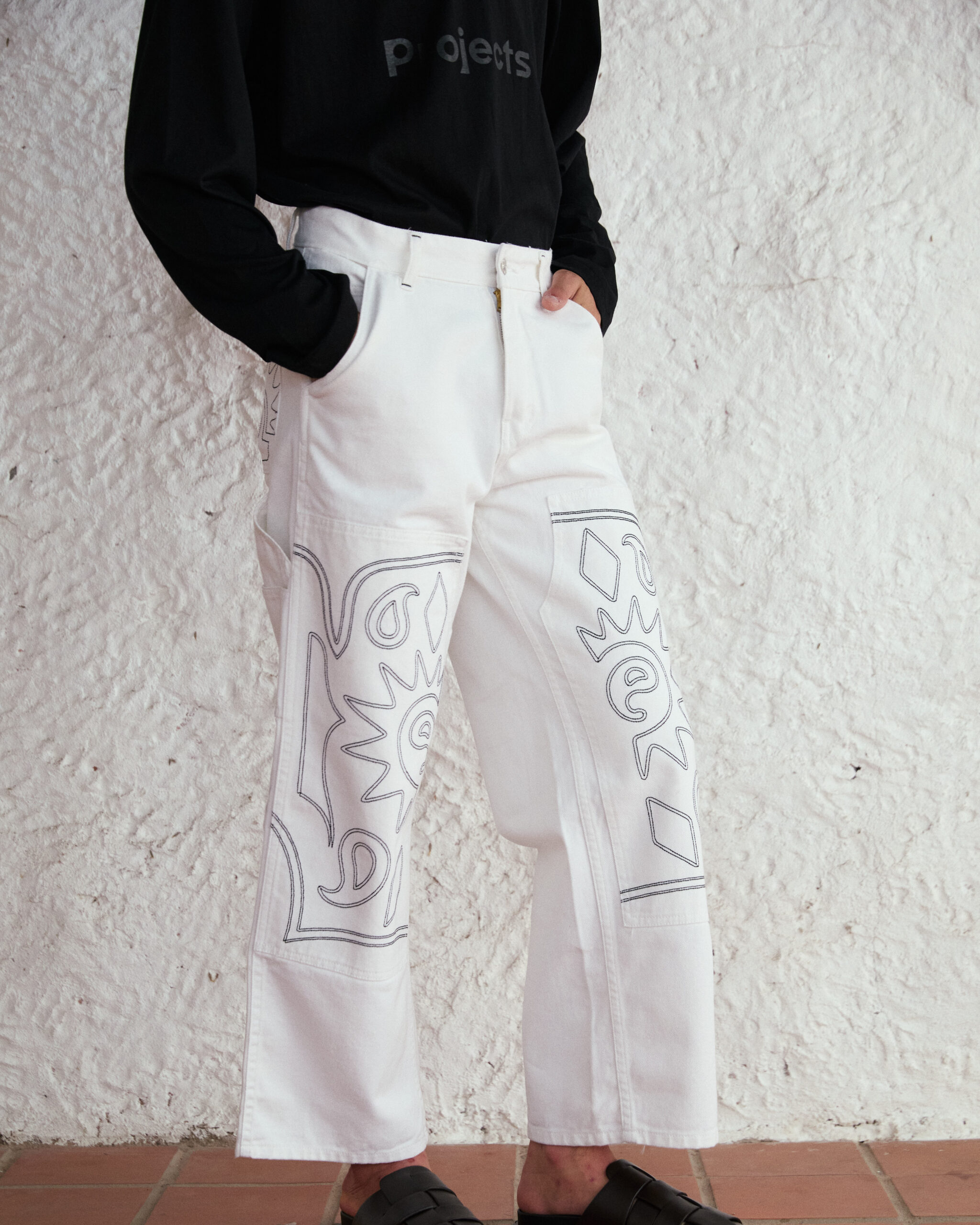 cargo denim pants with paisley and seashell graphic in western style embroderied detail.